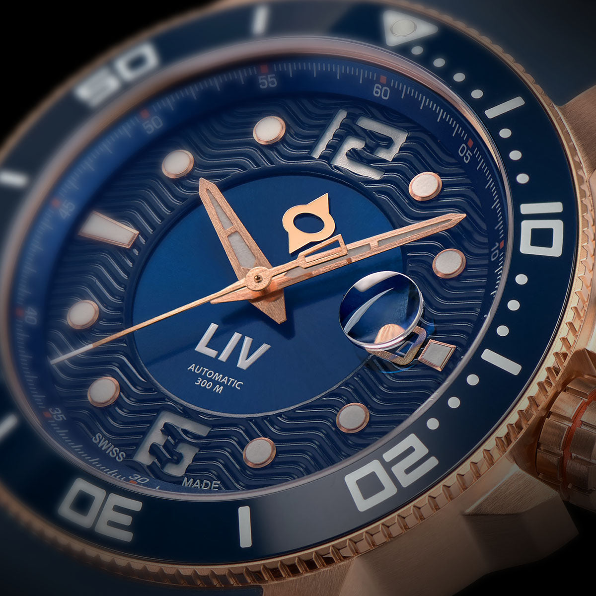 Fusion of rose gold & surgical grade 316L stainless steel and skeleton case-back, unidirectional 120-click black polished ceramic bezel ring, and screw-down crown with LIV logo enamel
