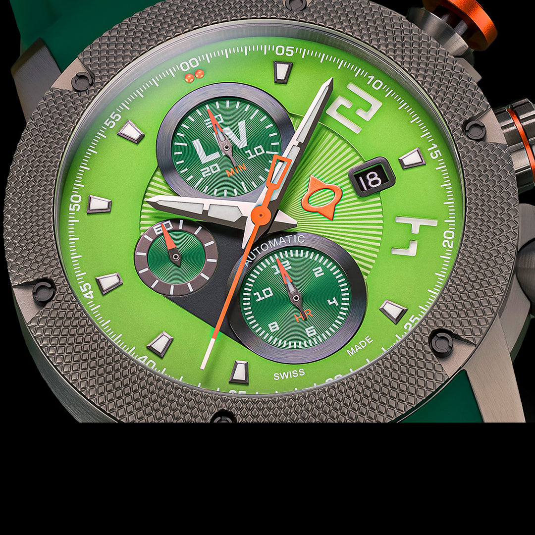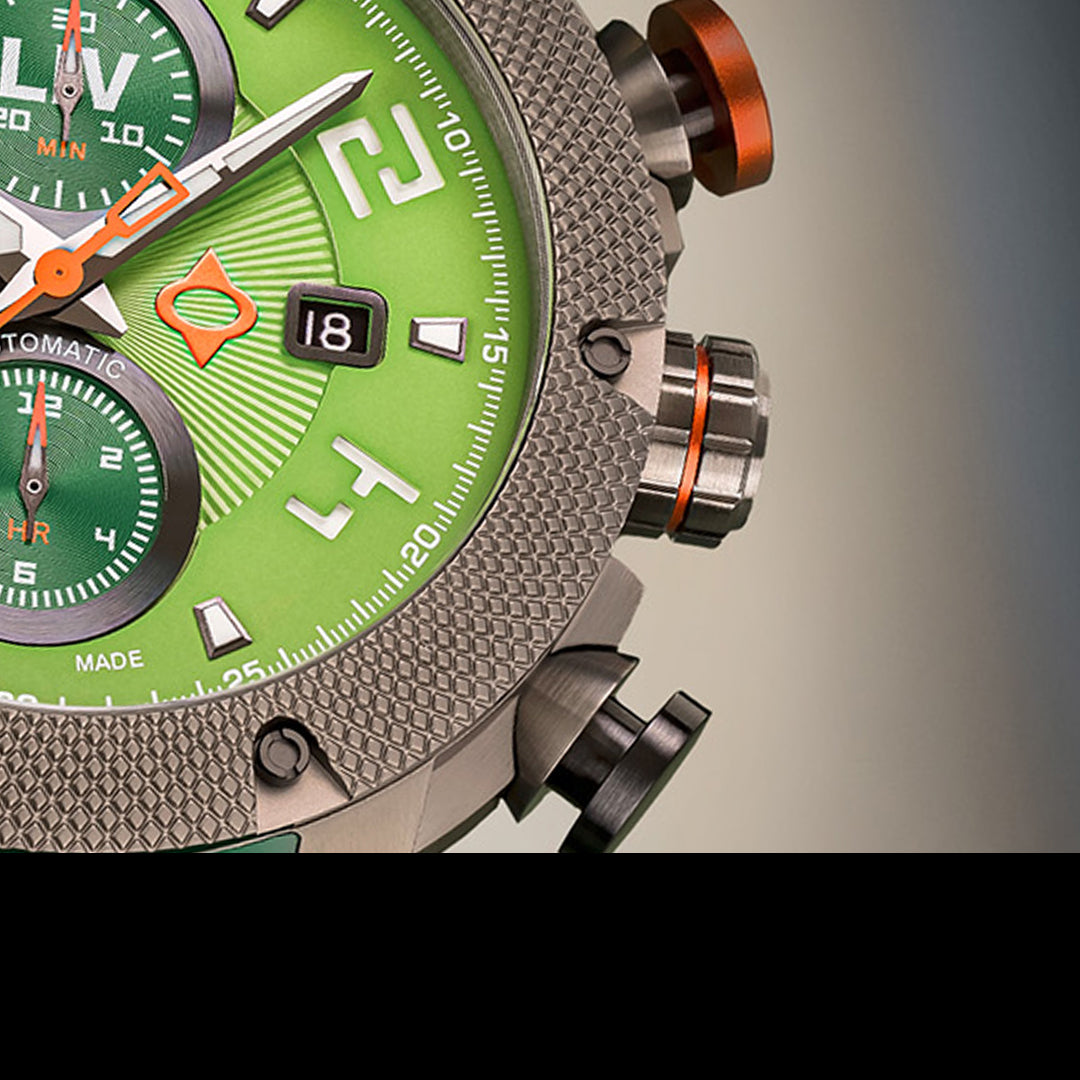 Surgical grade 316L stainless steel infused with gray IP and skeleton case-back, gray knurled bezel with screws, and screw-down crown with LIV logo enamel.