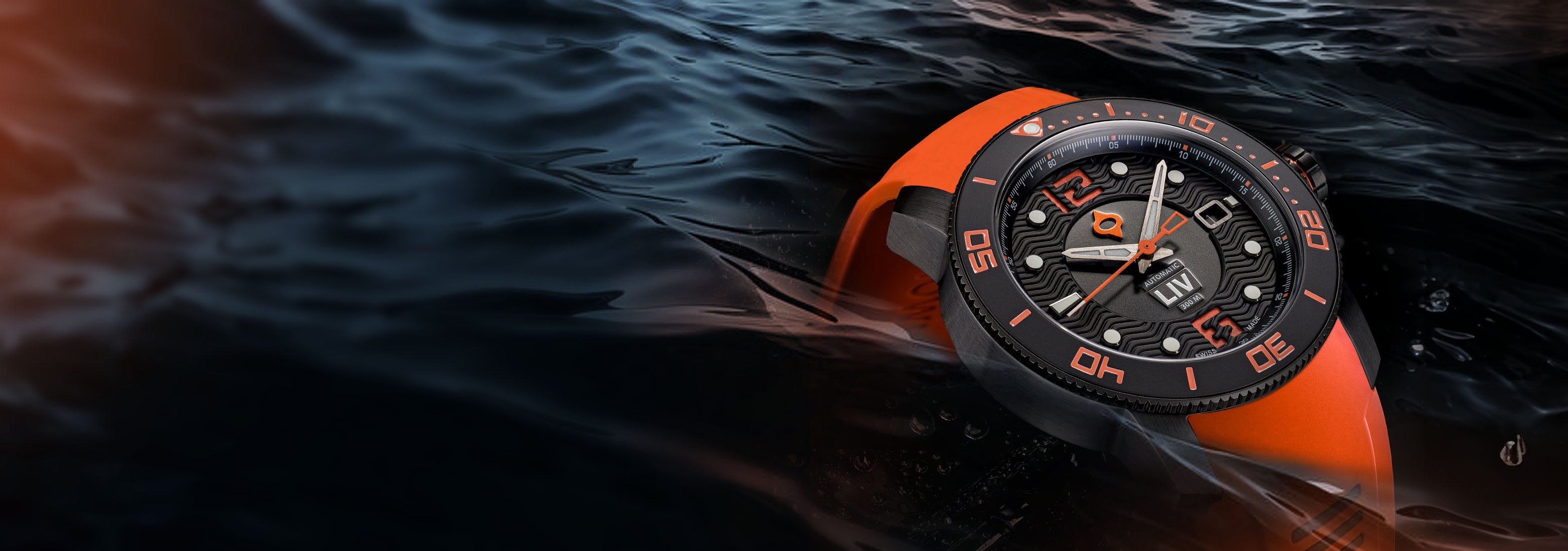 A true diver's watch thanks to our solidly constructed case, screw-down crown, and a sapphire crystal to accommodate the water depth pressures. It's rated to 300 meters, that's nearly 1000 feet.