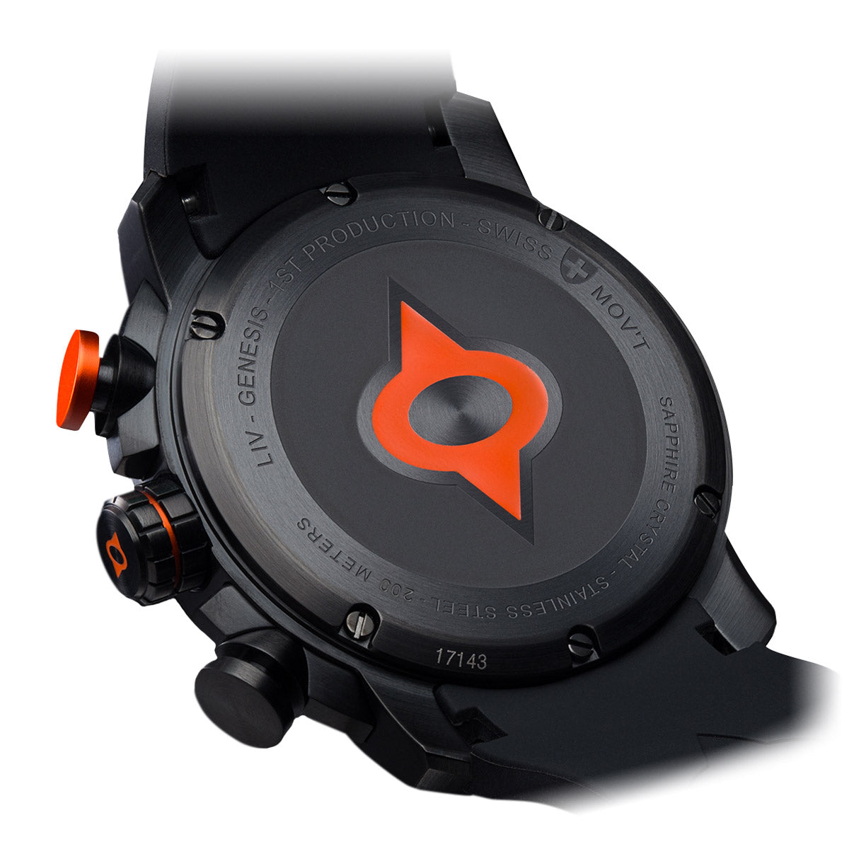 Surgical grade 316L stainless steel infused with black IP for beautiful color and durability, screw-down case-back, black knurled bezel with screws, and screw-down crown with LIV logo enamel