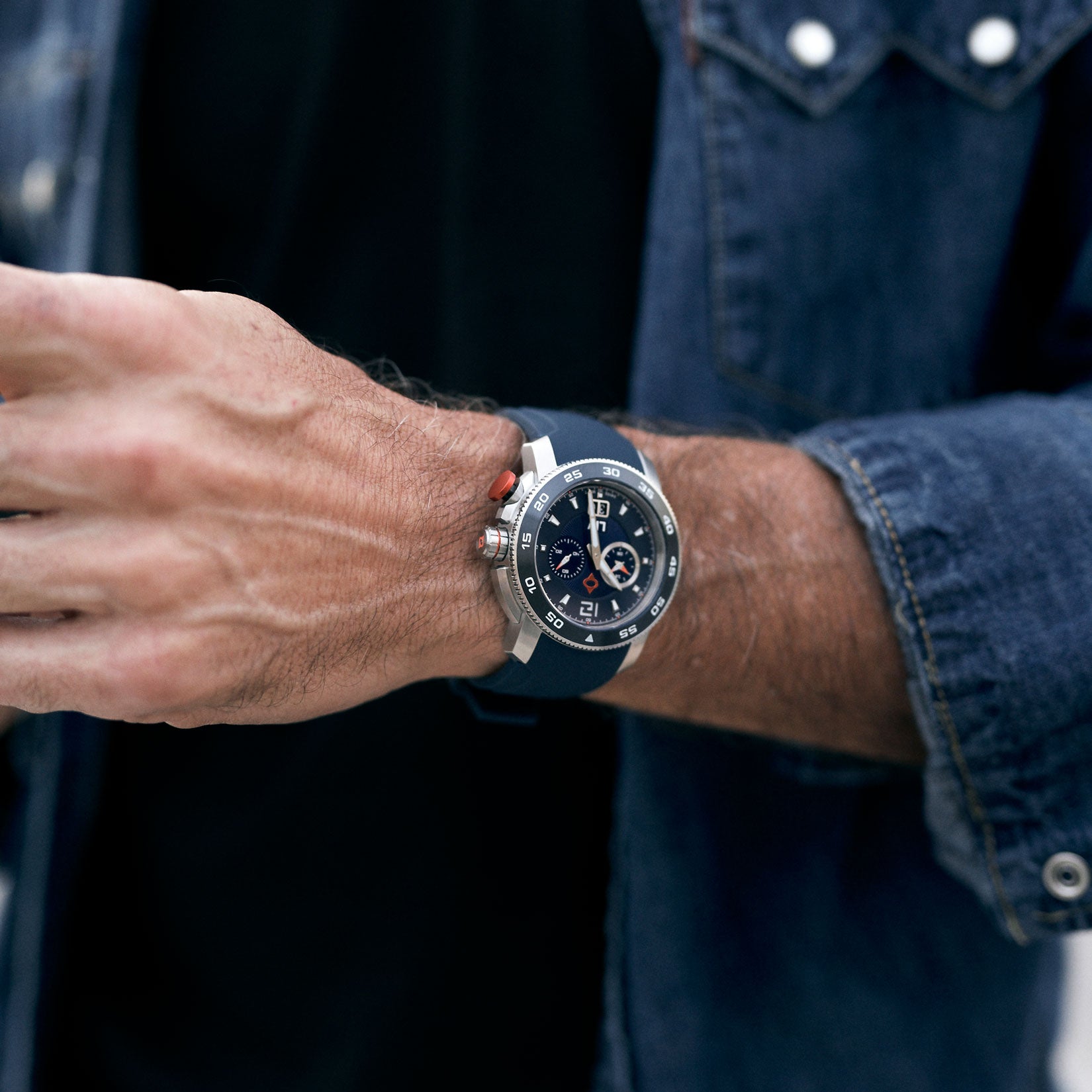 The GX ALARM Type- D STEEL COBALT features a multi-layer blue dial, Swiss Ronda startech Caliber 4120.B, 7 jewels analog alarm movement with jumbo date, a surgical grade 316L stainless steel case, a scratch-resistant & anti-reflective sapphire crystal, a push-down crown, and water-resistant to 200 meters.