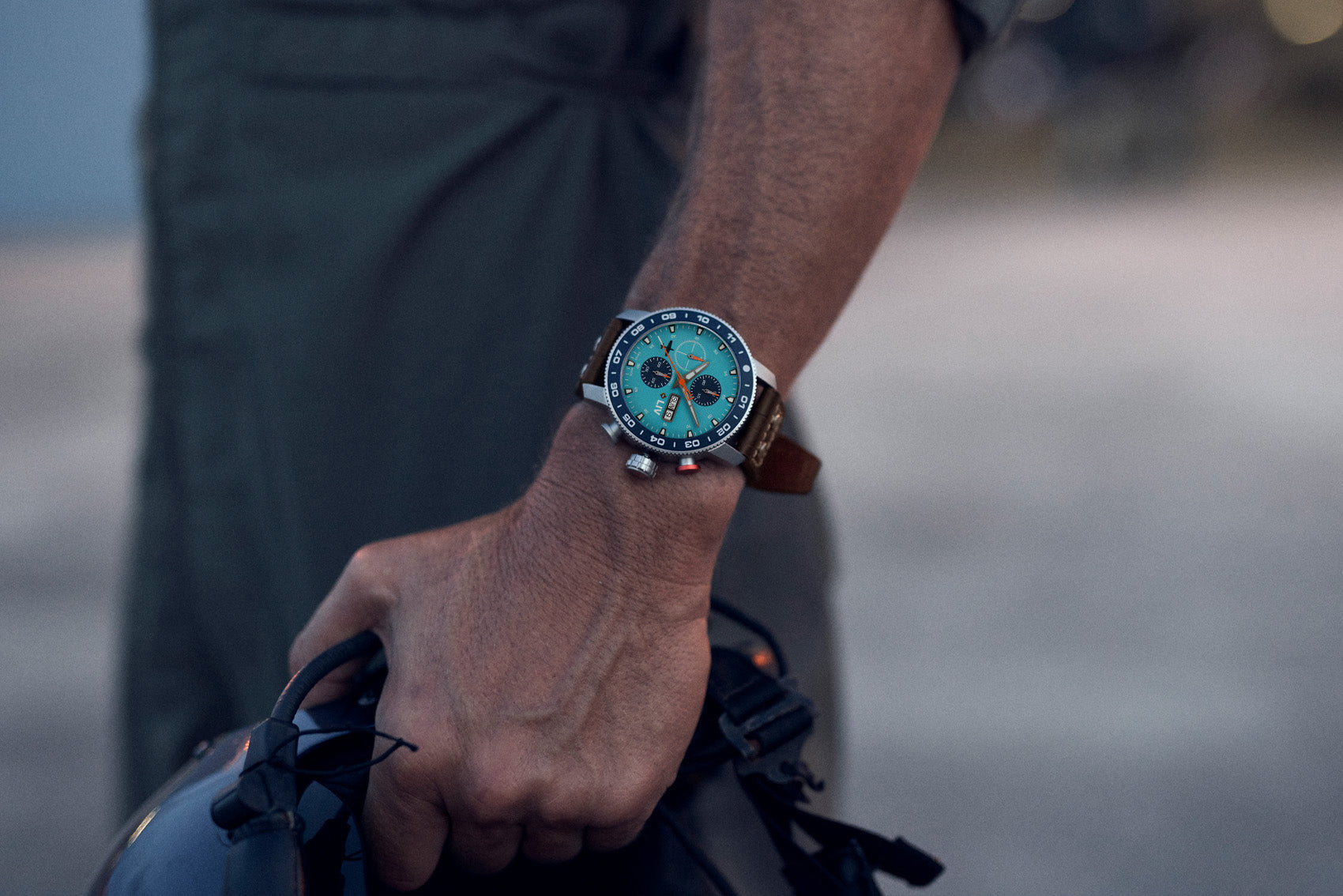 P-51 352nd / Cripes A' Mighty limited edition watch. Crafted with a Swiss automatic chronograph and high-grade titanium case, this masterpiece boasts a 42-hour power reserve and is certified to +/- 5 SPD. The elegant light blue dial is adorned with hand-applied indexes filled with BGW9 Swiss Luminoiva, while the scratch-resistant sapphire crystal and water-resistant design make it both functional and luxurious. Only 1000 pieces available. The deployant buckle is included.