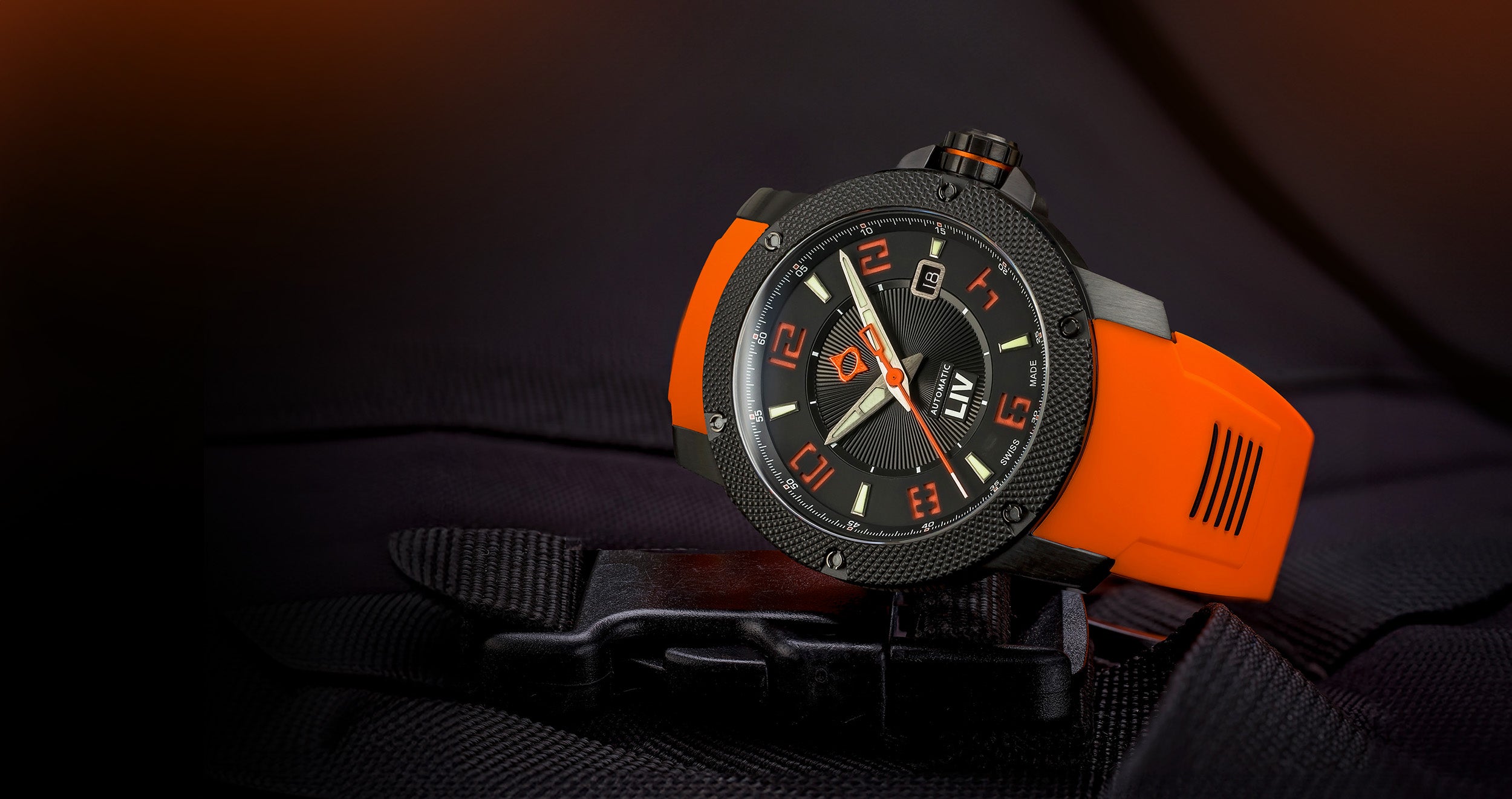 The LIV GX1-A Signature Orange features a multi-layer black dial, an Elaboré grade, 26-jewel Swiss automatic movement, a date window, a 42-hour power reserve, a 316L stainless steel black IP case with skeleton case-back, a scratch-resistant & anti-reflective sapphire crystal, a screw-down crown, and water-resistant to 100 meters.