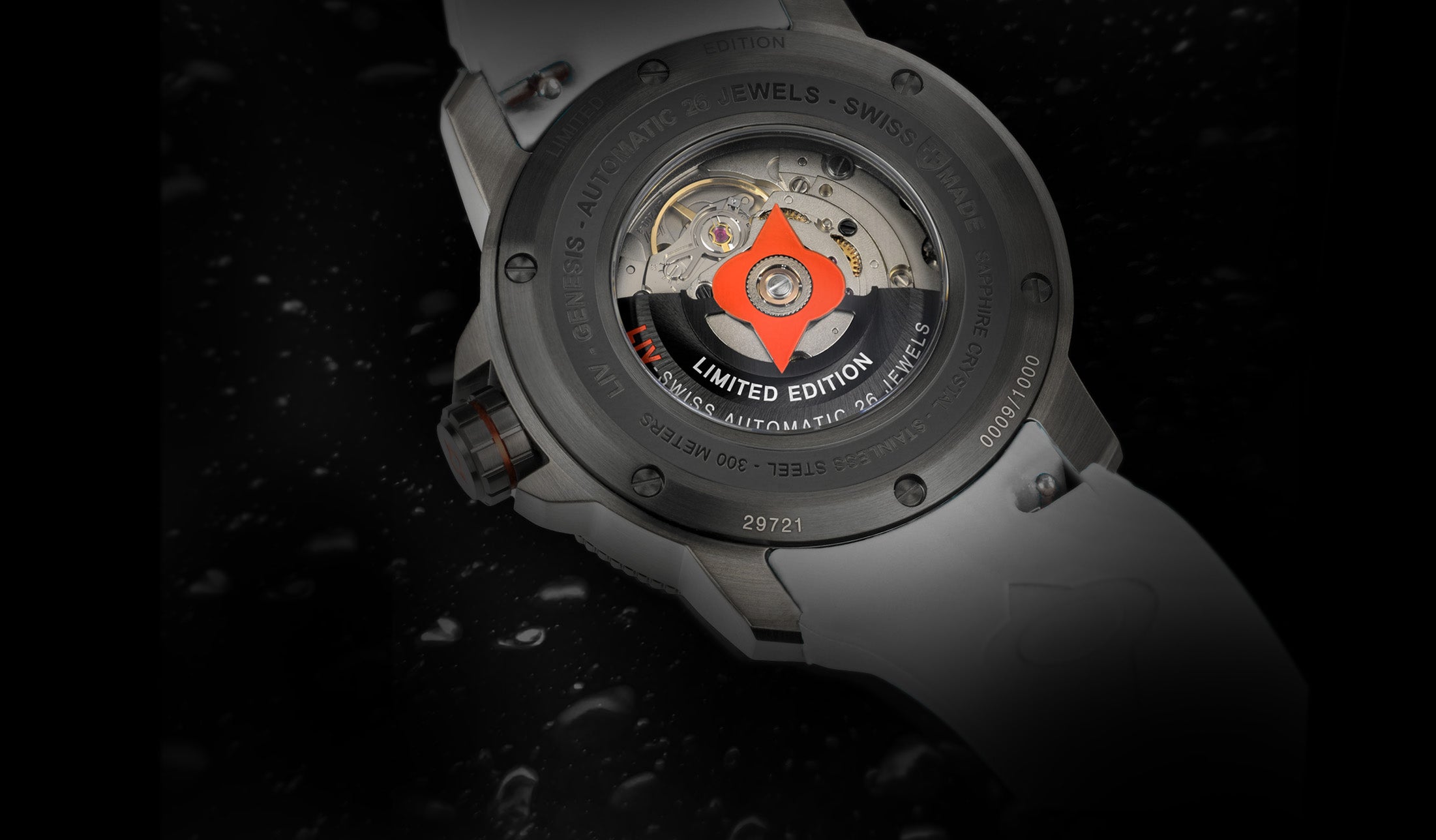 Surgical grade 316L stainless steel and skeleton case-back, unidirectional 120-click black polished ceramic bezel ring, and screw-down crown with LIV logo enamel