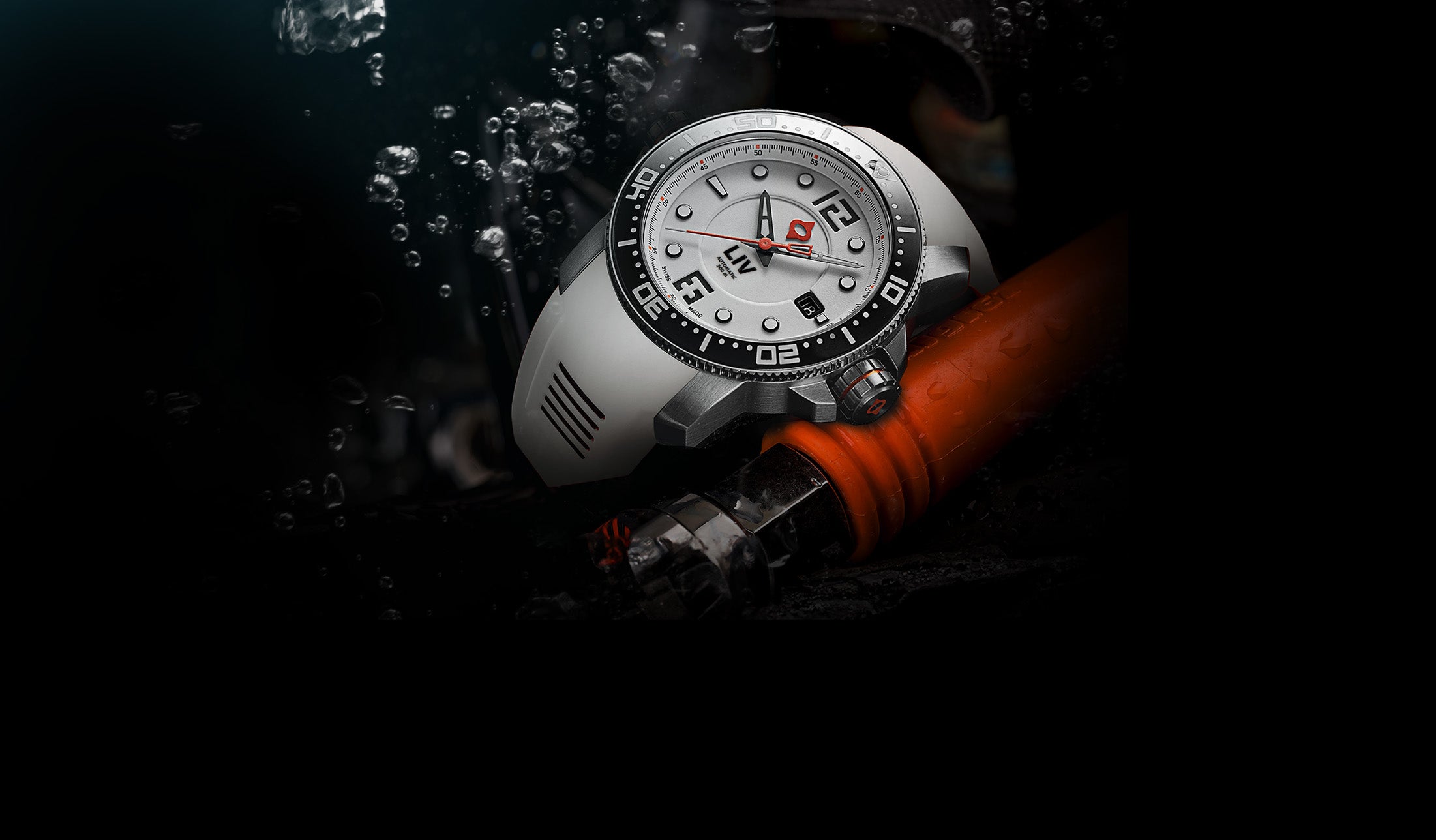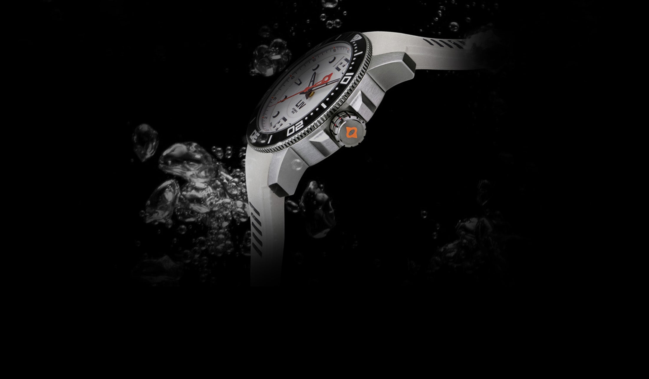 A true diver's watch thanks to our solidly constructed case, screw-down crown, and a sapphire crystal to accommodate the water depth pressures. It's rated to 300 meters, that's nearly 1000 feet.