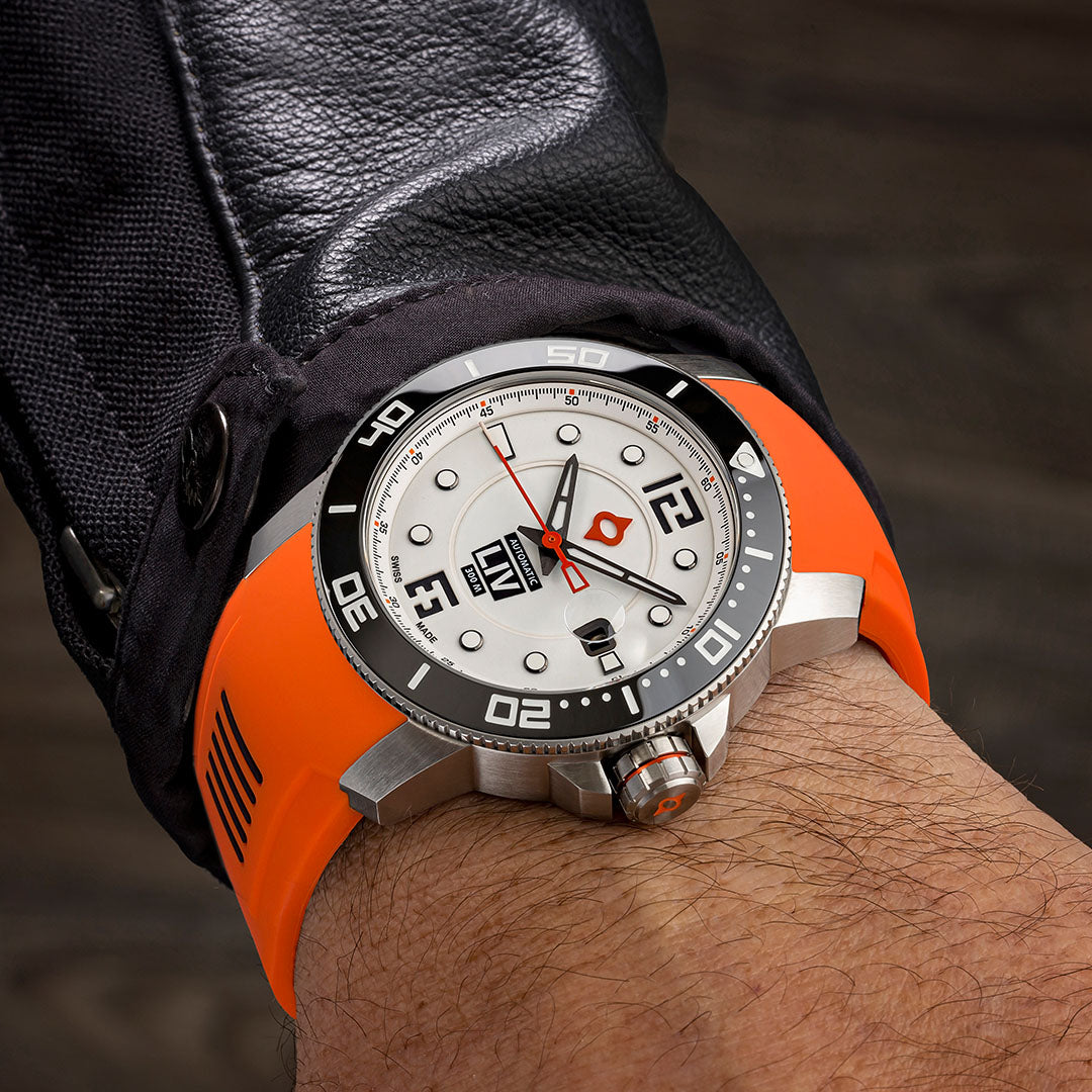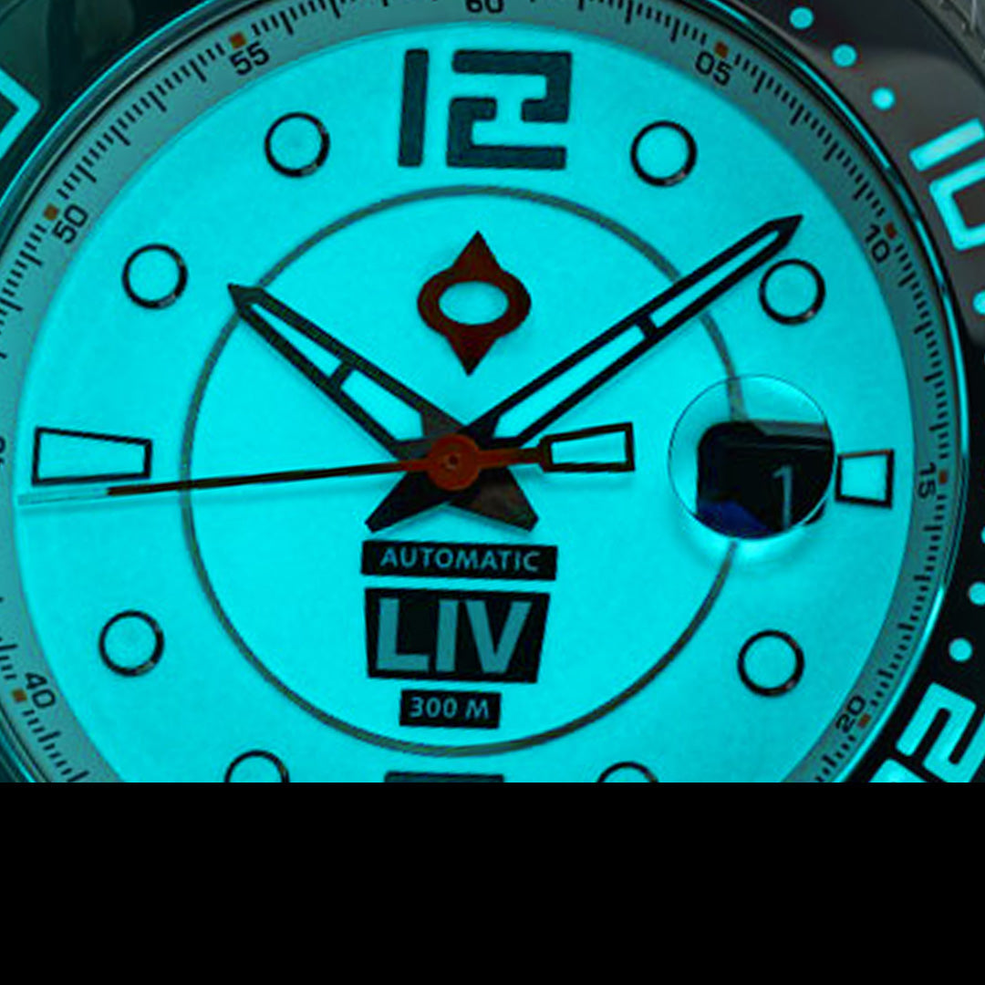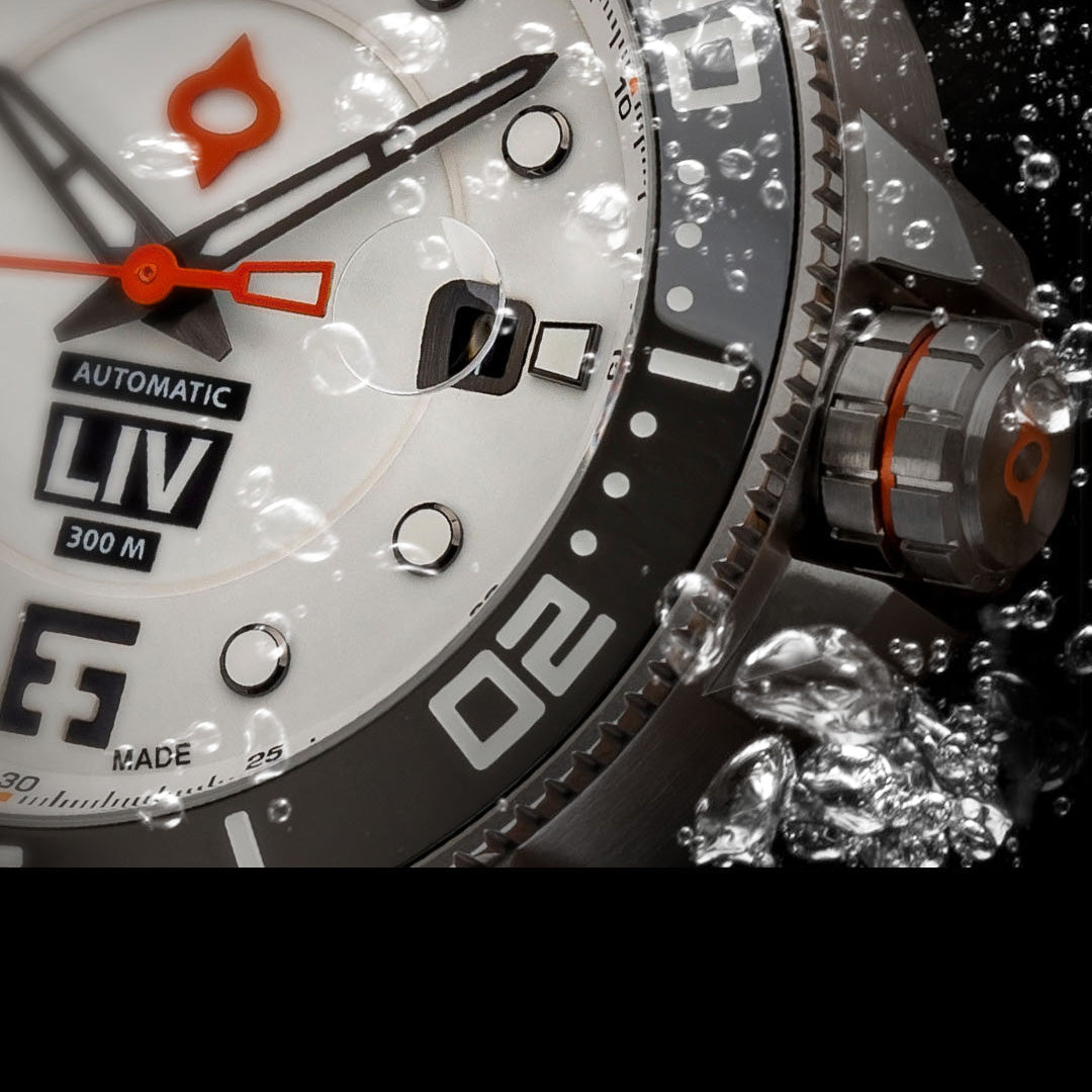 Surgical grade 316L stainless steel and skeleton case-back, unidirectional 120-click black polished ceramic bezel ring, and screw-down crown with LIV logo enamel