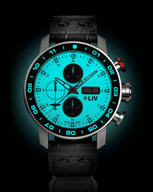 The LIV P-51 Full Lume features a flat open white dial coated with BGW9 Swiss Super-LumiNova pigments and black, contrasting sub-dials. It's powered by an ETA 7750, 25-jewel Swiss automatic movement and features a day-date window, a 42-hour power reserve, a sandblasted high-grade titanium case with skeleton case-back, unidirectional 120-click polished ceramic black bezel, a scratch-resistant & anti-reflective sapphire crystal, a screw-down crown, and water-resistant to 100 meters.