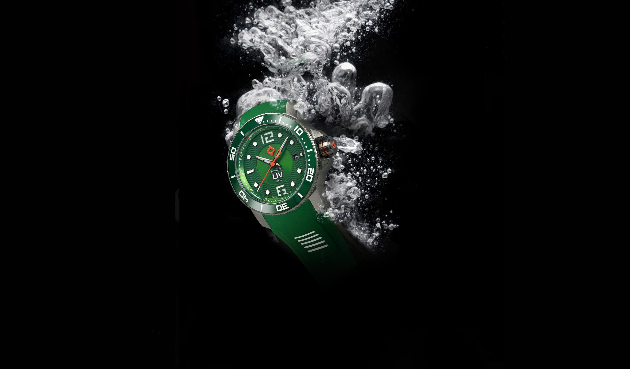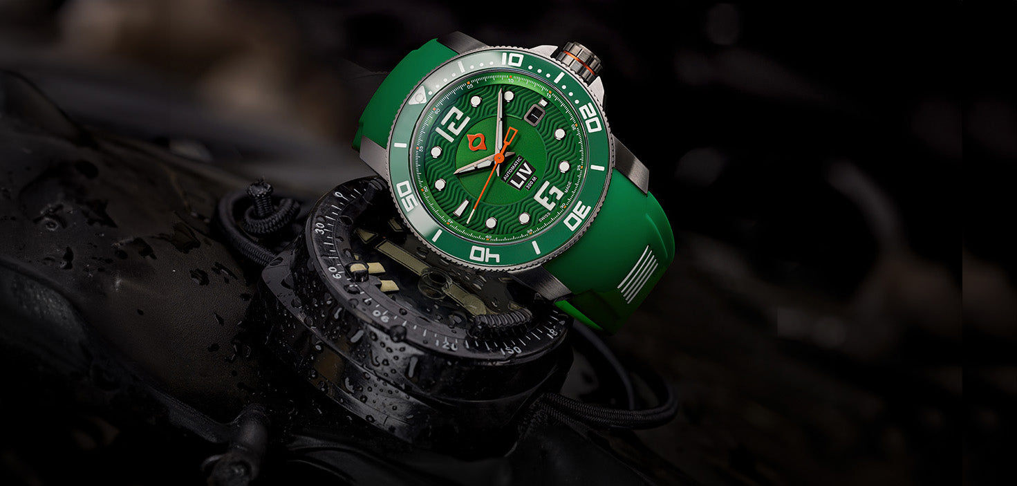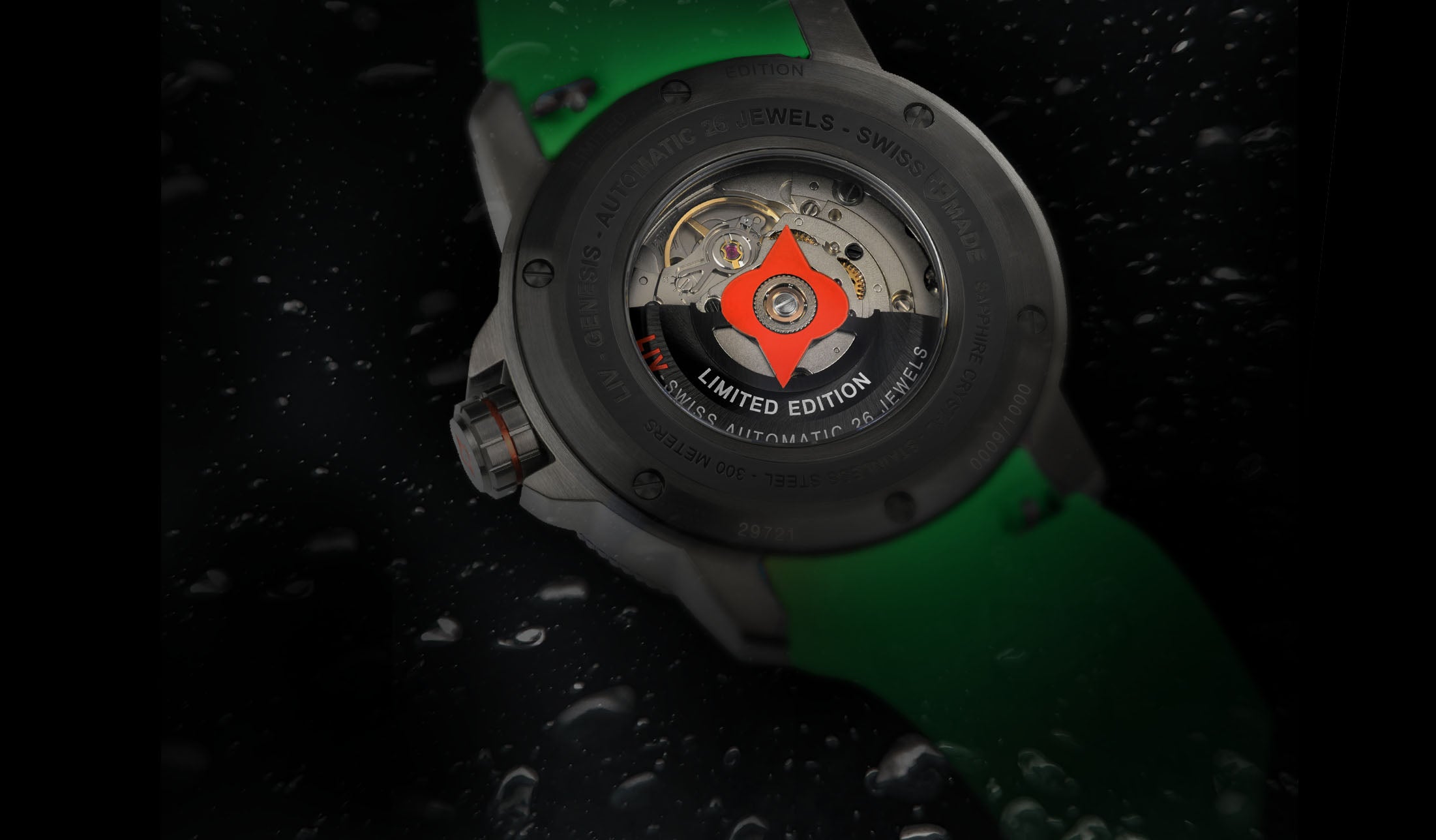 Surgical grade 316L stainless steel infused with gray IP and skeleton case-back, unidirectional 120-click green ceramic bezel ring, and screw-down crown with LIV logo enamel