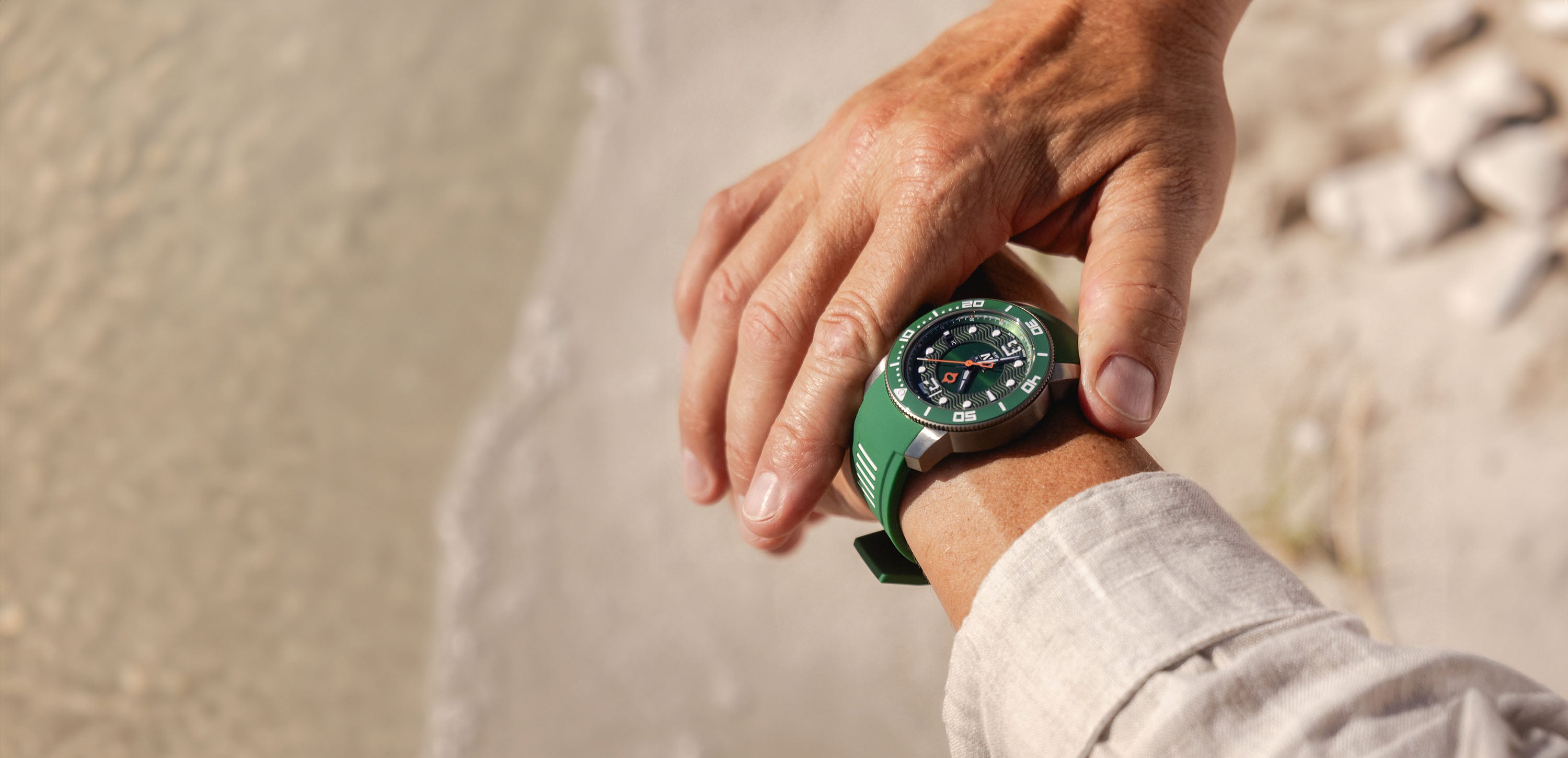 Unique green dial, applied indexes, and steel sword-shaped hands with BGW9 luminescence
