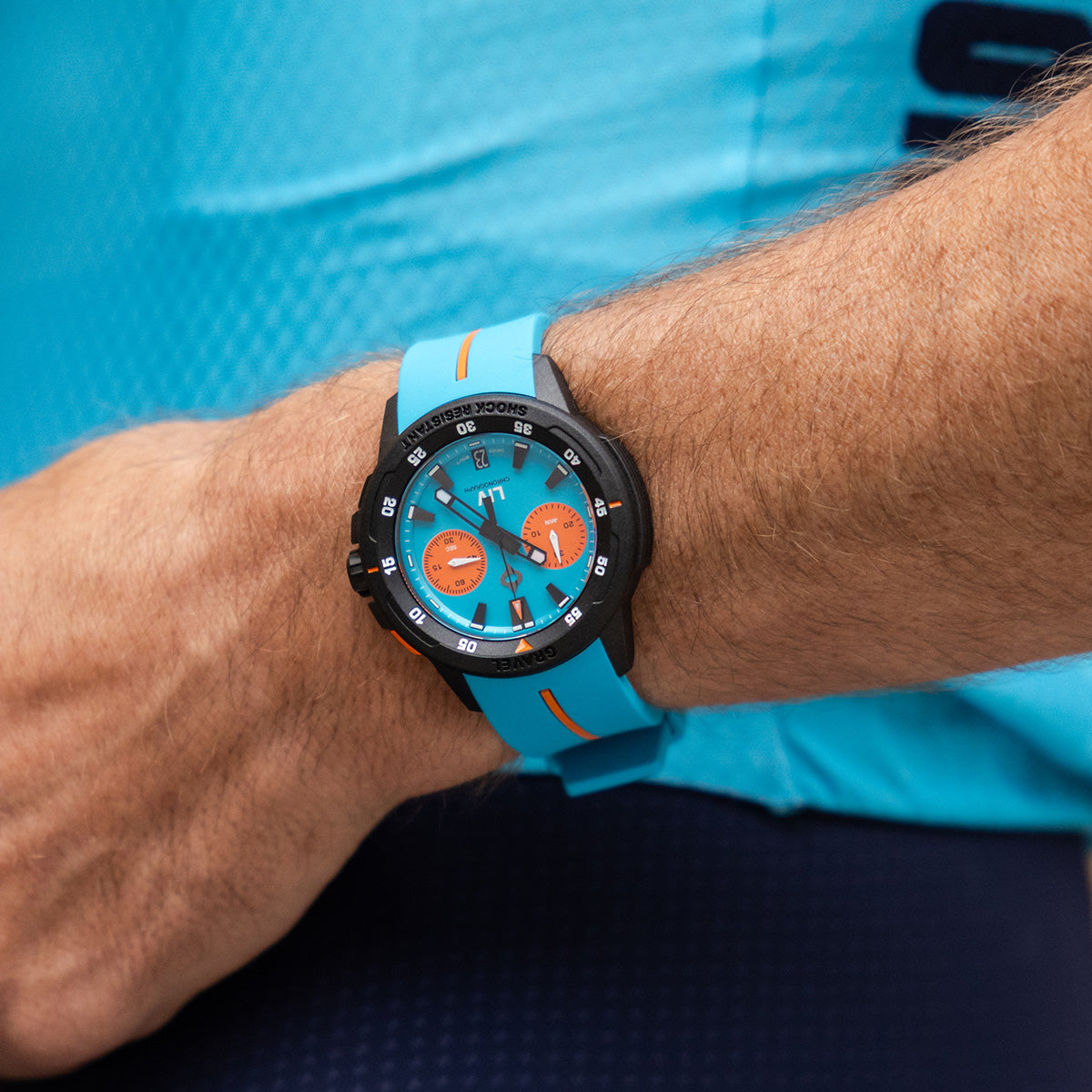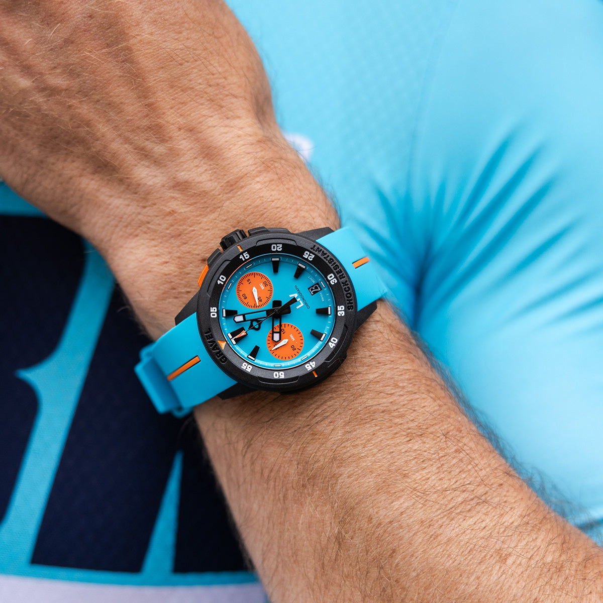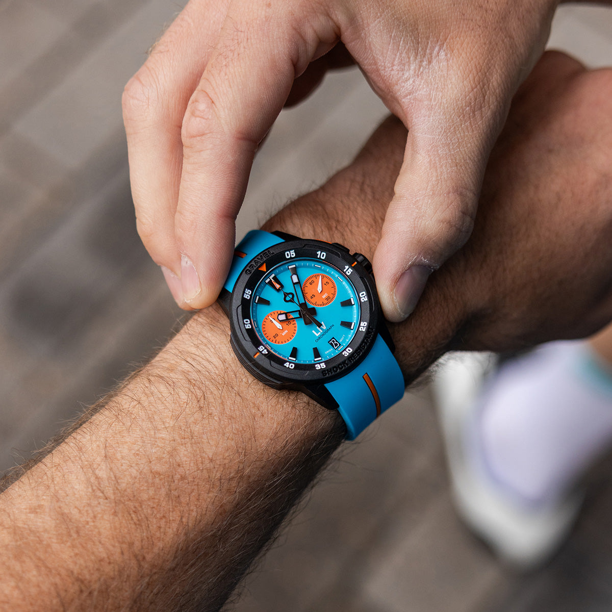 G2 McQueen GT40 is a powder blue & orange color multi-layer dial with big claw-shaped floating indexes to give it its 3D design. Each index has a BGW9 Swiss Super-LumiNova stripe. Hands (Hour, minute & second) are brushed stainless steel and gunmetal color with BGW9 Swiss Lume center and ends.