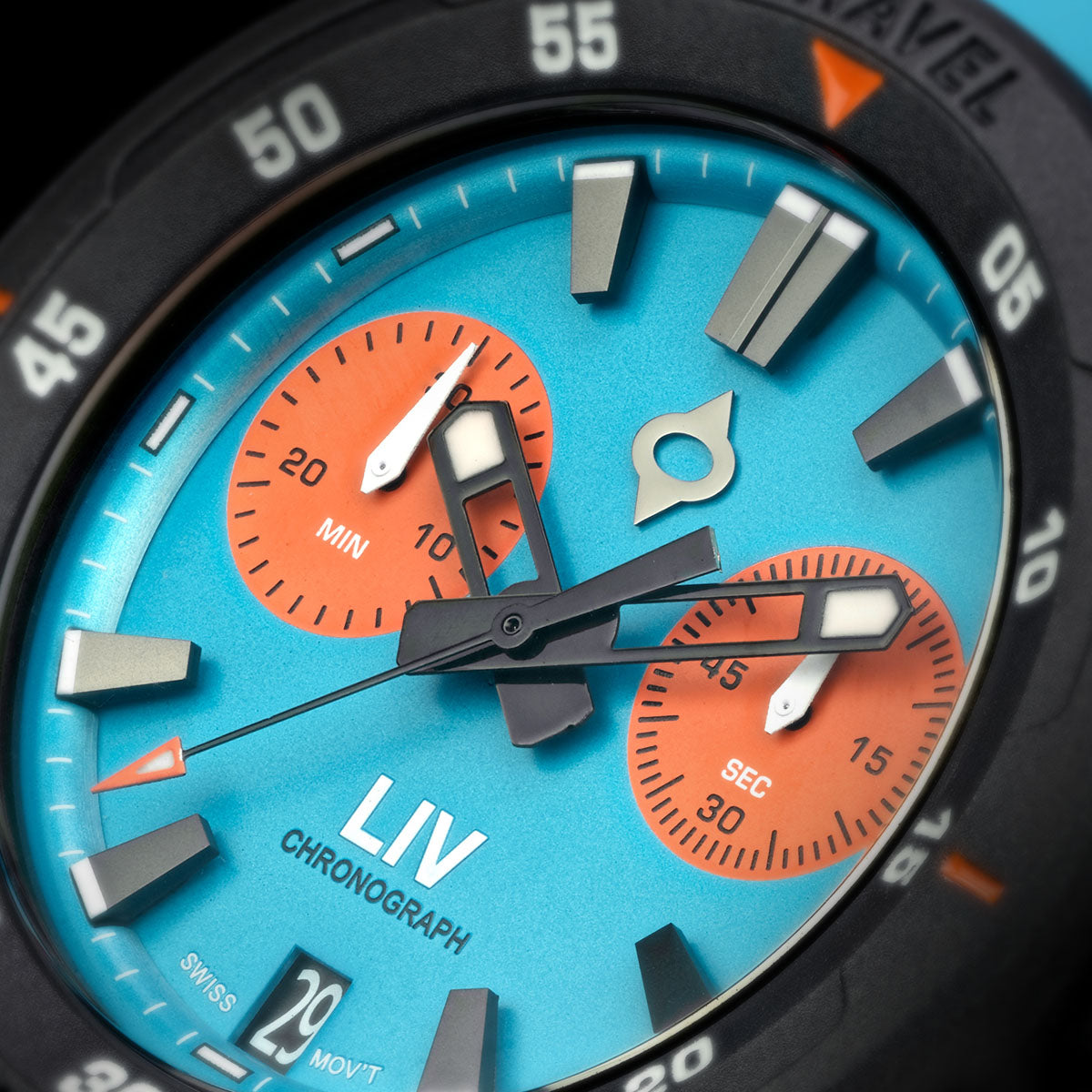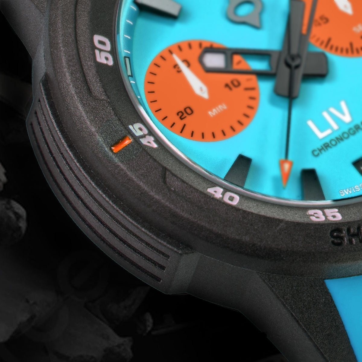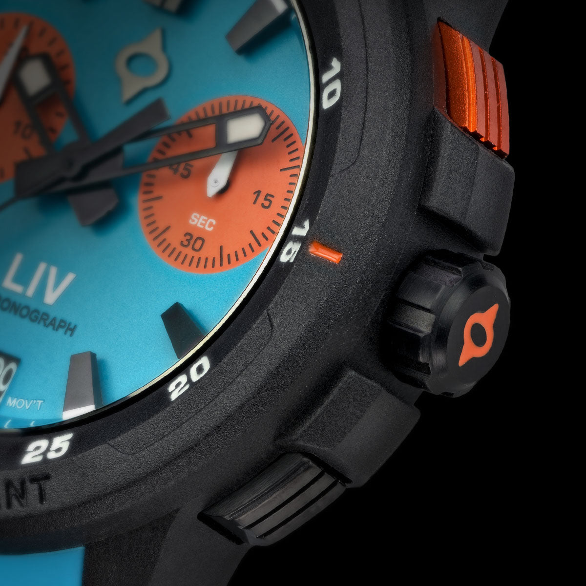 The LIV Gravel is water-resistant to 100 meters or 330 feet, and the push-in crown features a double-gasket system to ensure no water will ever get into your Gravel watch.