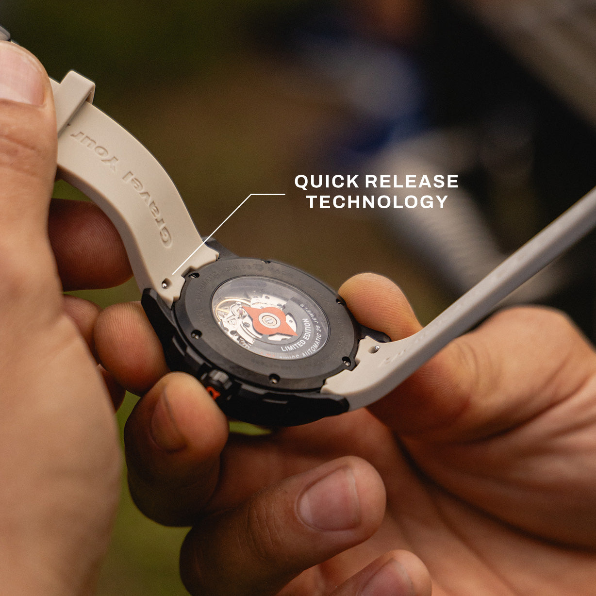 Featuring our form-fit custom silicone strap with quick release technology. Made with premium silicone for complete comfort that molds perfectly around your wrist, The straps fit both the Gravel 001 and Gravel 002.