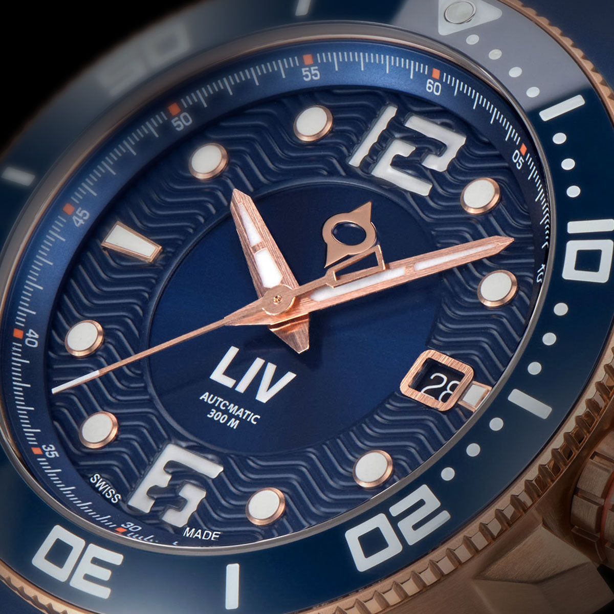 A true diver's watch thanks to our solidly constructed case, screw-down crown, and a sapphire crystal to accommodate the water depth pressures. It's rated to 300 meters, that's nearly 1000 feet.