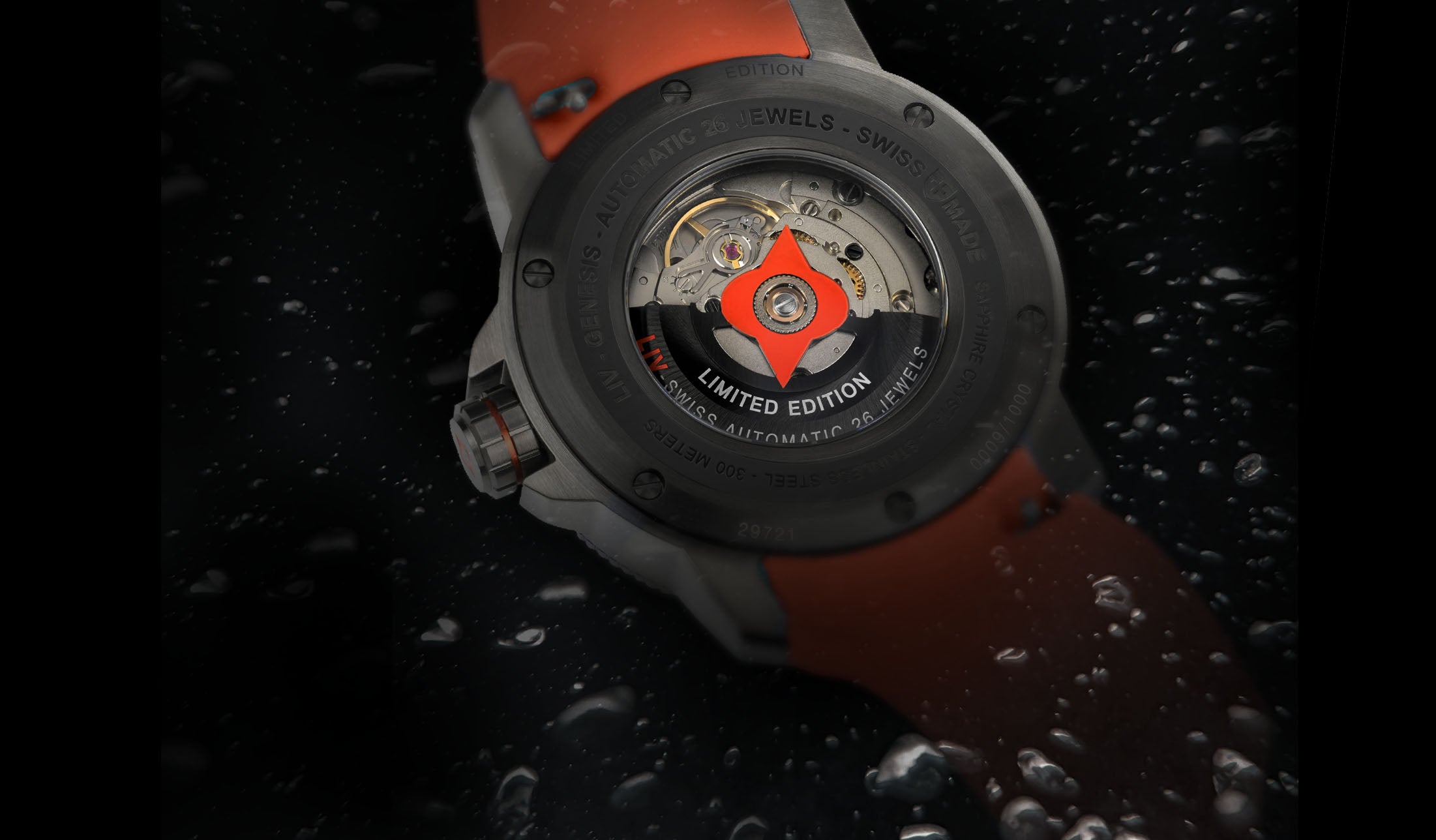A true diver's watch thanks to our solidly constructed case, screw-down crown, and a sapphire crystal to accommodate the water depth pressures. It's rated to 300 meters, that's nearly 1000 feet.