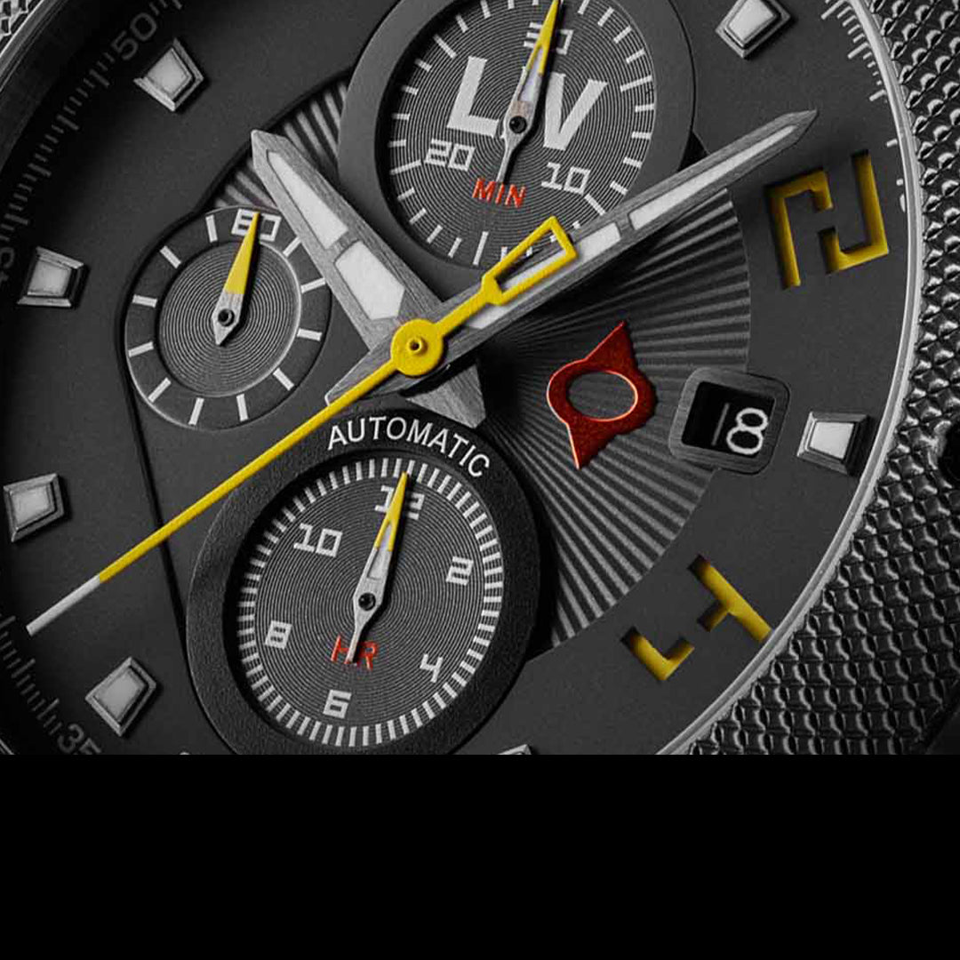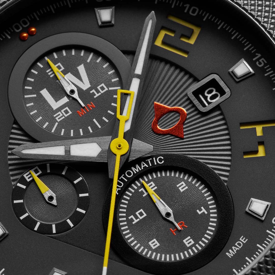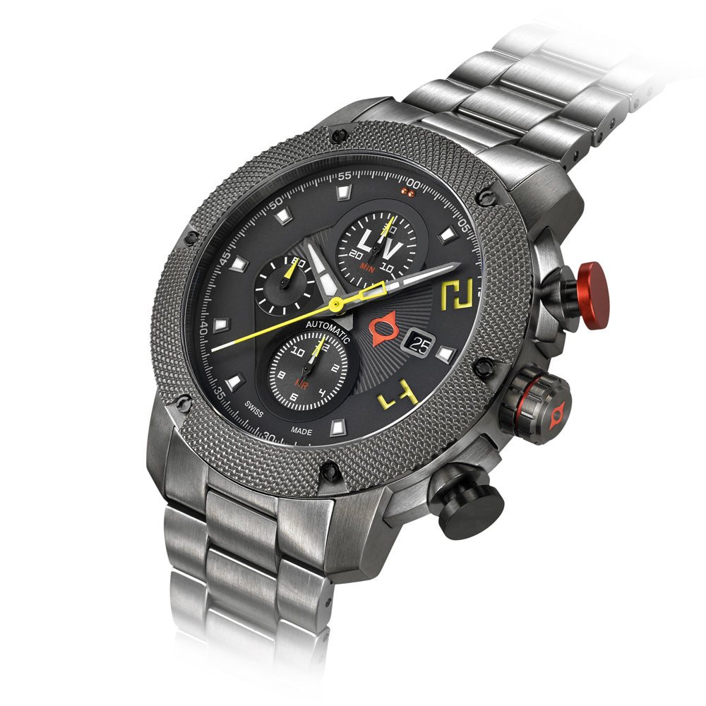 Surgical grade 316L stainless steel infused with gray IP and skeleton case-back, gray knurled bezel with screws, and screw-down crown with LIV logo enamel