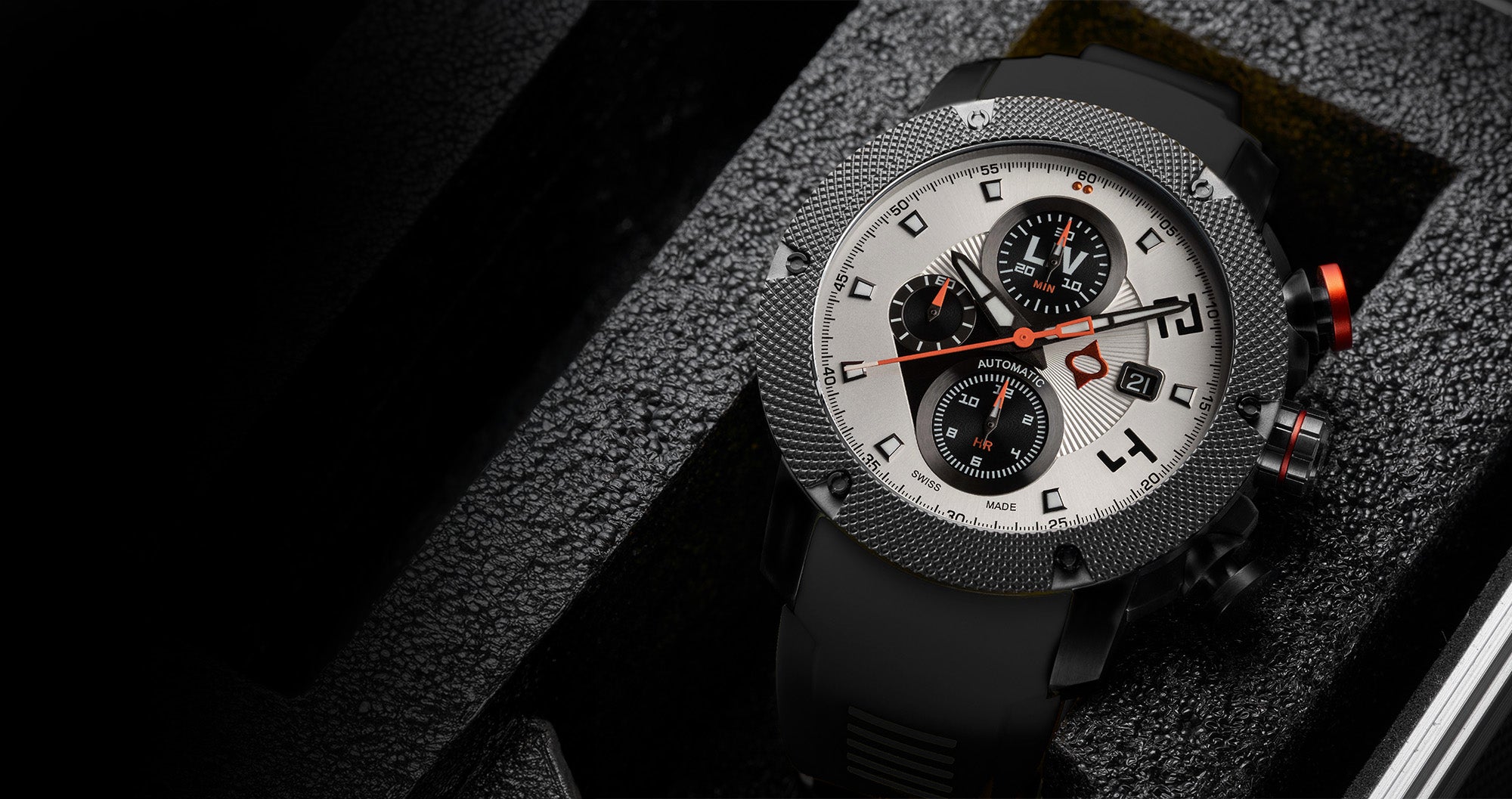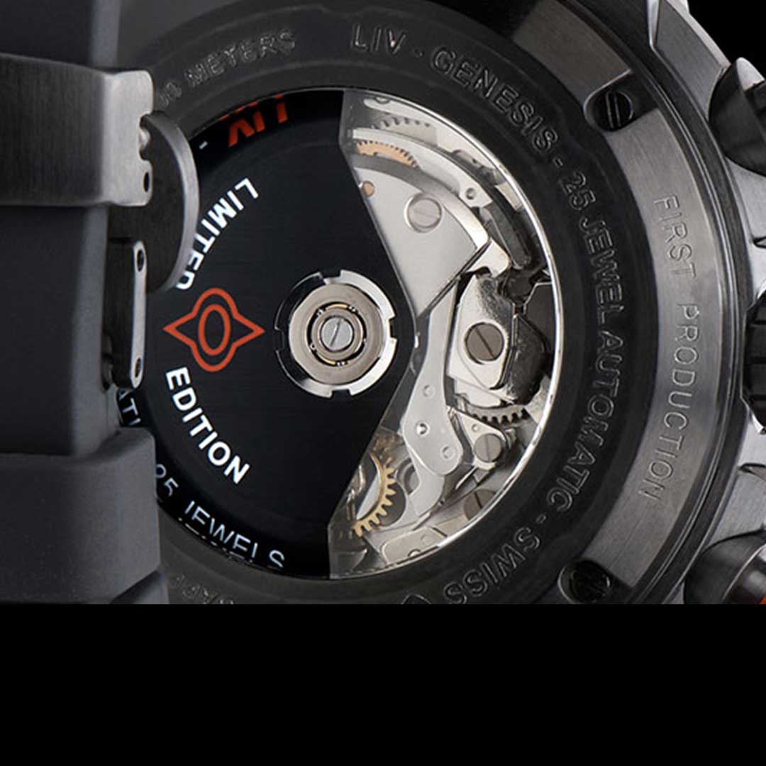 Surgical grade 316L stainless steel and skeleton case-back, black knurled bezel with screws, and screw-down crown with LIV logo enamel.