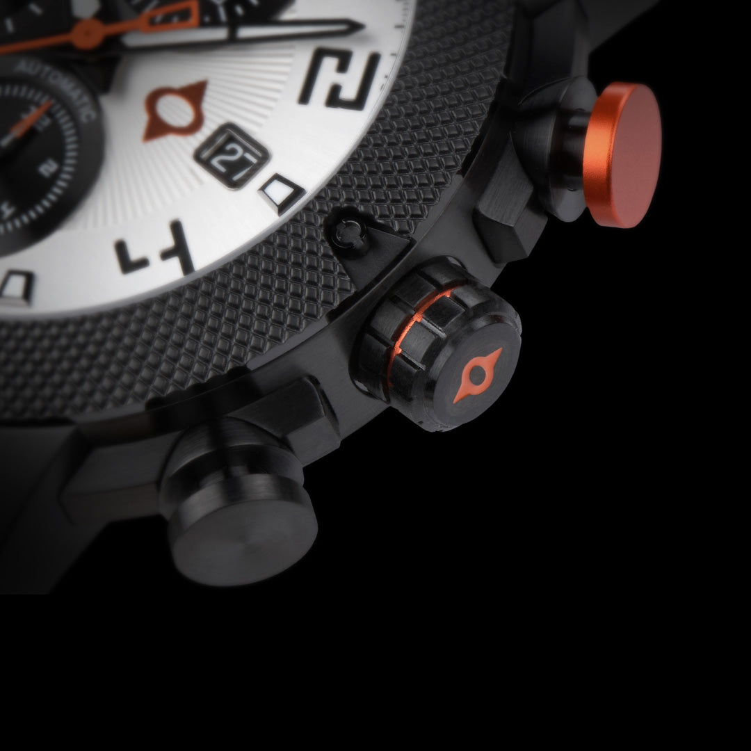 Knurled bezel and unique chronograph buttons.