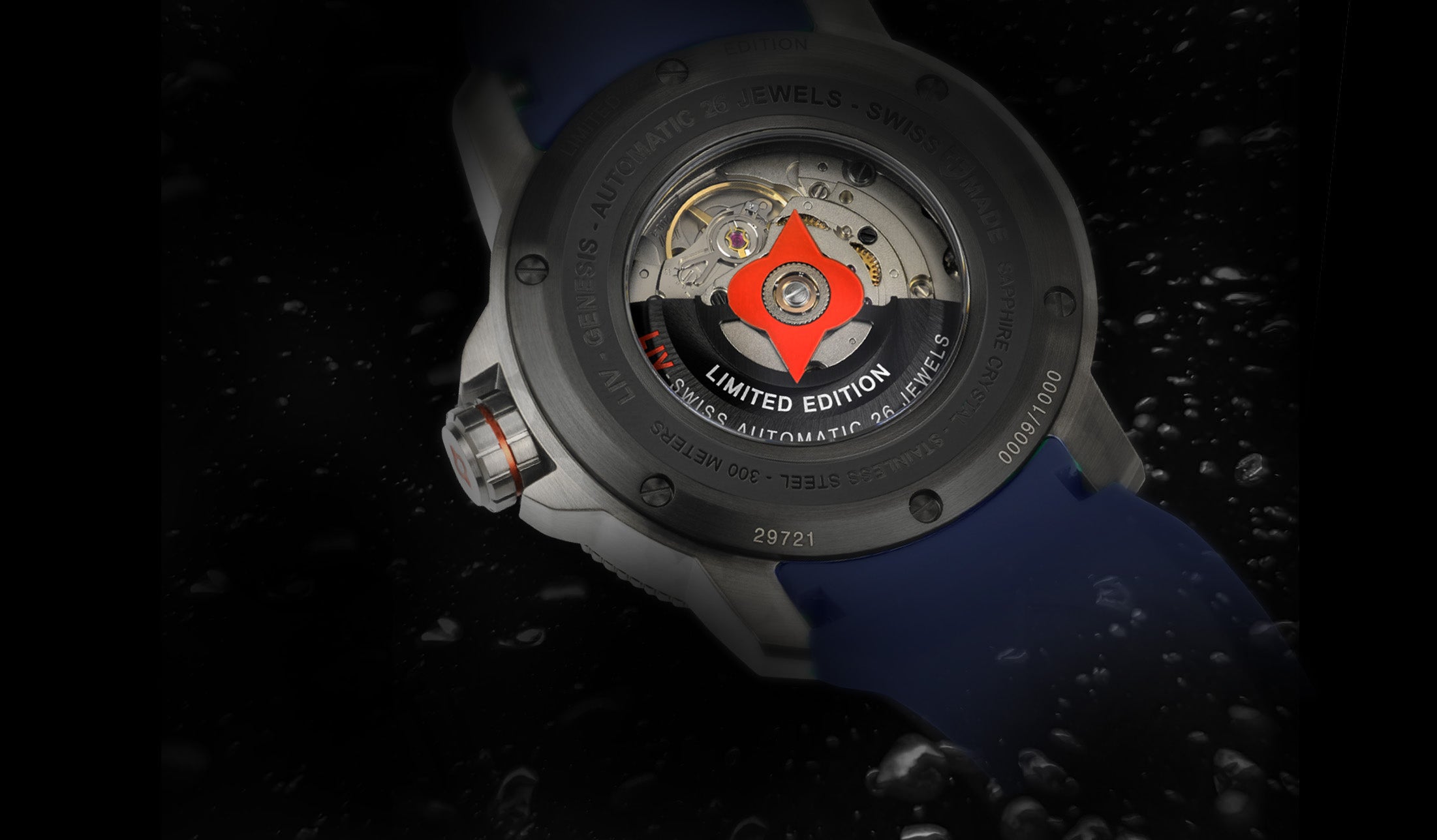 A true diver's watch thanks to our solidly constructed case, screw-down crown, and a sapphire crystal to accommodate the water depth pressures. It's rated to 300 meters, that's nearly 1000 feet.
