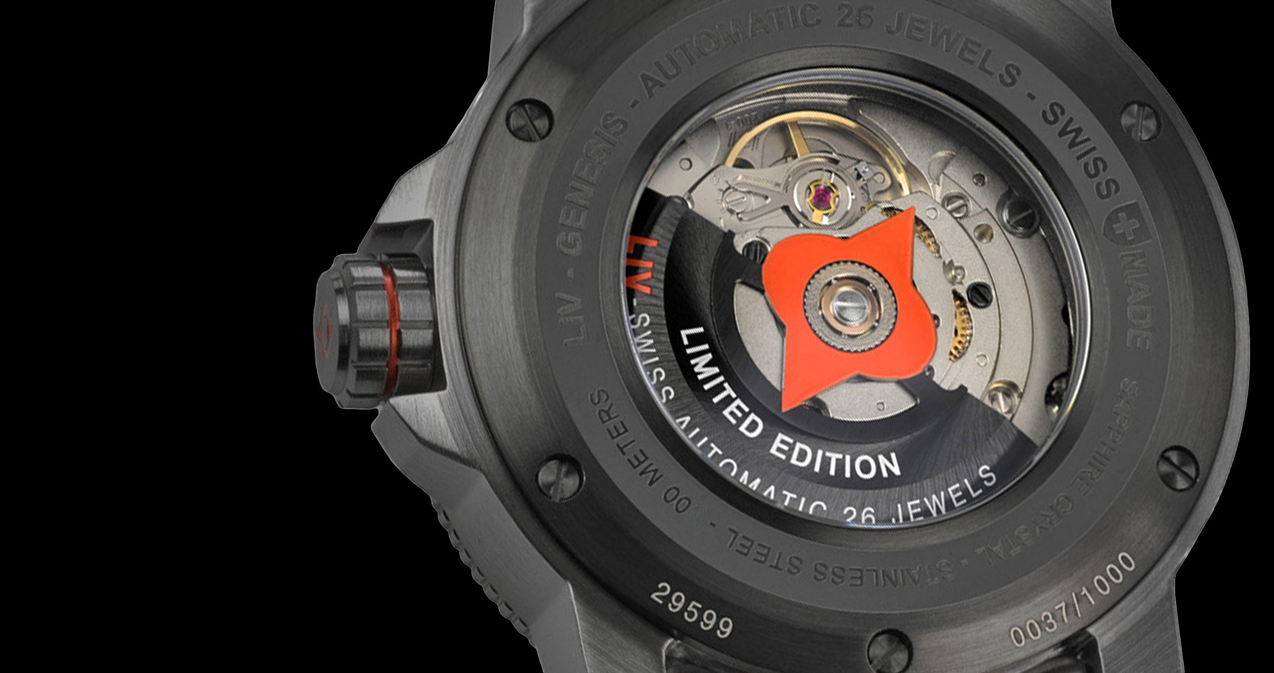 Surgical grade 316L stainless steel infused with black IP and skeleton case-back, knurled bezel with screws, and screw-down crown with LIV logo enamel