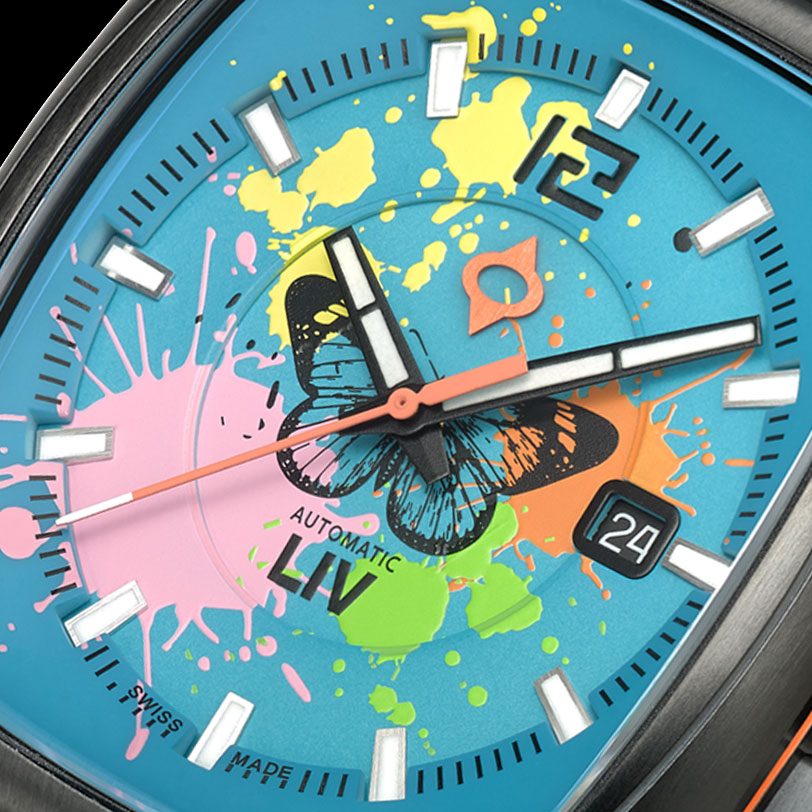 This watch features a one-of-a-kind, gorgeous dial on a stadium shape; the concave ring drops down from the crystal's edge and ends flush with the signature multi-layer LIV sandwich dial, helping your eye focus on telling time.