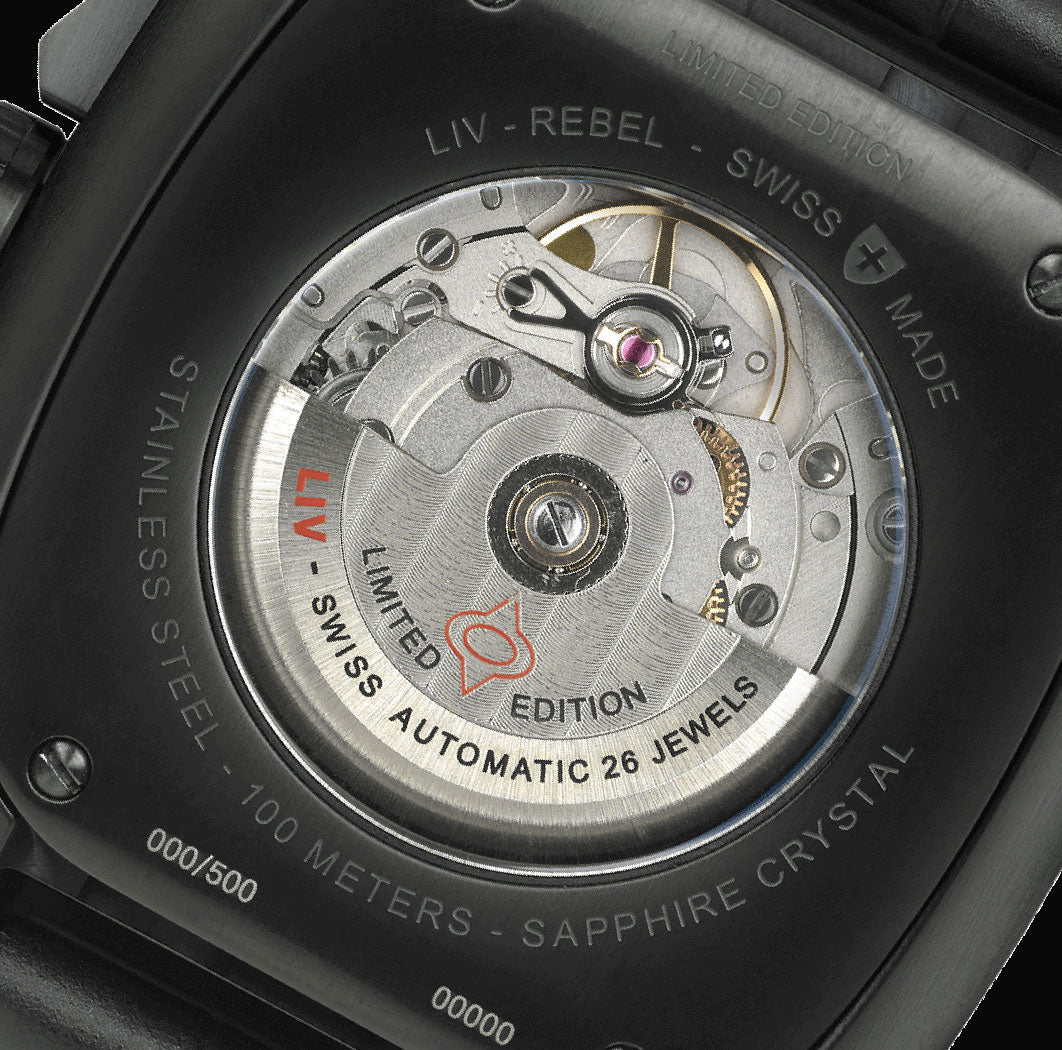 Surgical grade 316L stainless steel infused with black IP curved design and push in crown and skeleton case-back, and screw-down crown with LIV logo enamel